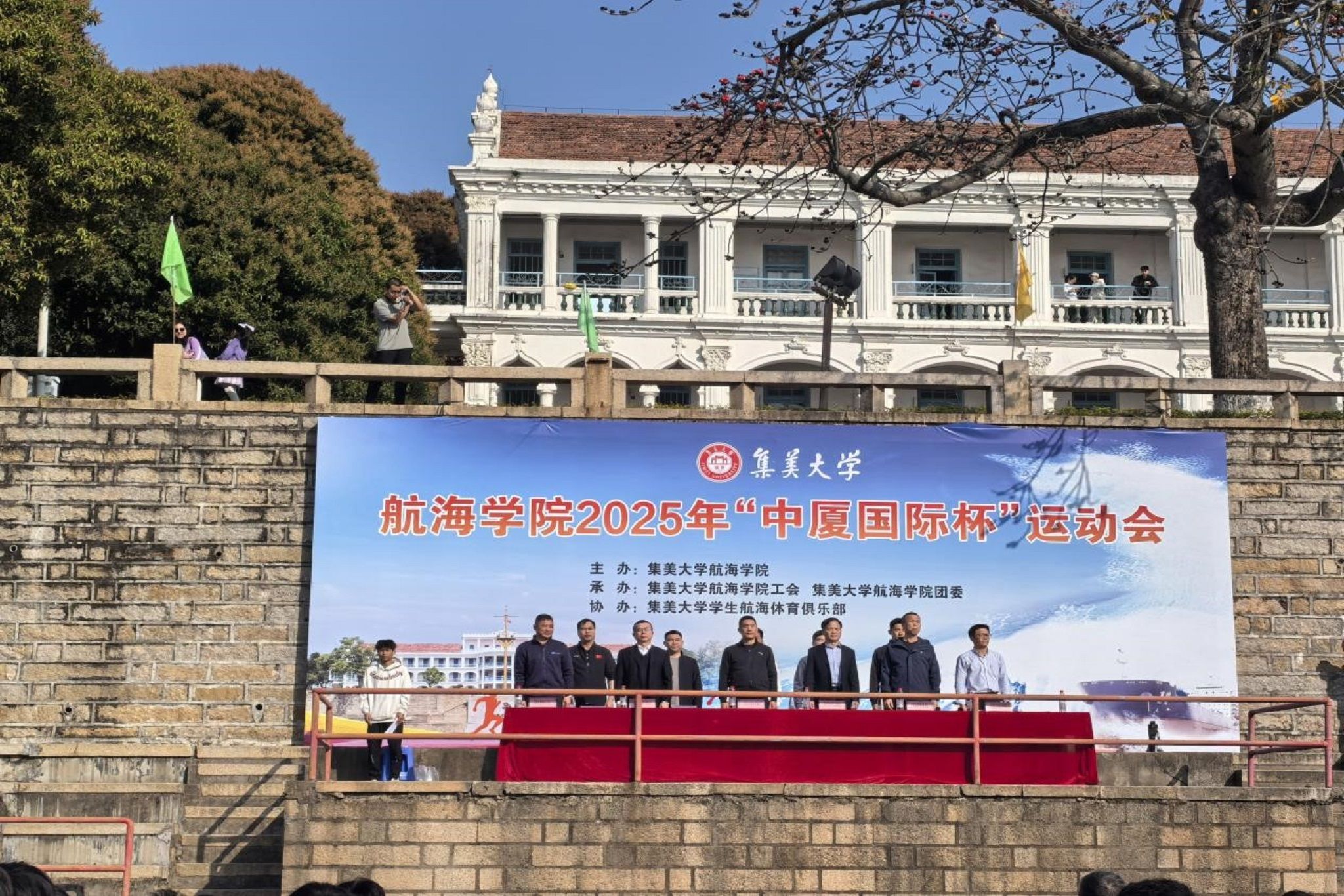 院长杨神化致开幕辞,他希望全体师生以嘉庚体育精神为基础,持之以恒地参加体育锻炼;以嘉庚体育精神为指导,公平地参与体育竞赛活动;以嘉庚体育精神为方向,坚持不懈、科学有效地强身健体。黄跃德表示,赛场上挥洒的汗水既诠释着竞技体育的激情,也映射着航海人迎难而上的风骨。中厦国际始终关注青年航海学子成长,未来将通过校企实训、技术共享等方式,助力培养兼具实践力与国际视野的卓越航运人才。院党委书记王小军宣布运动会开幕。