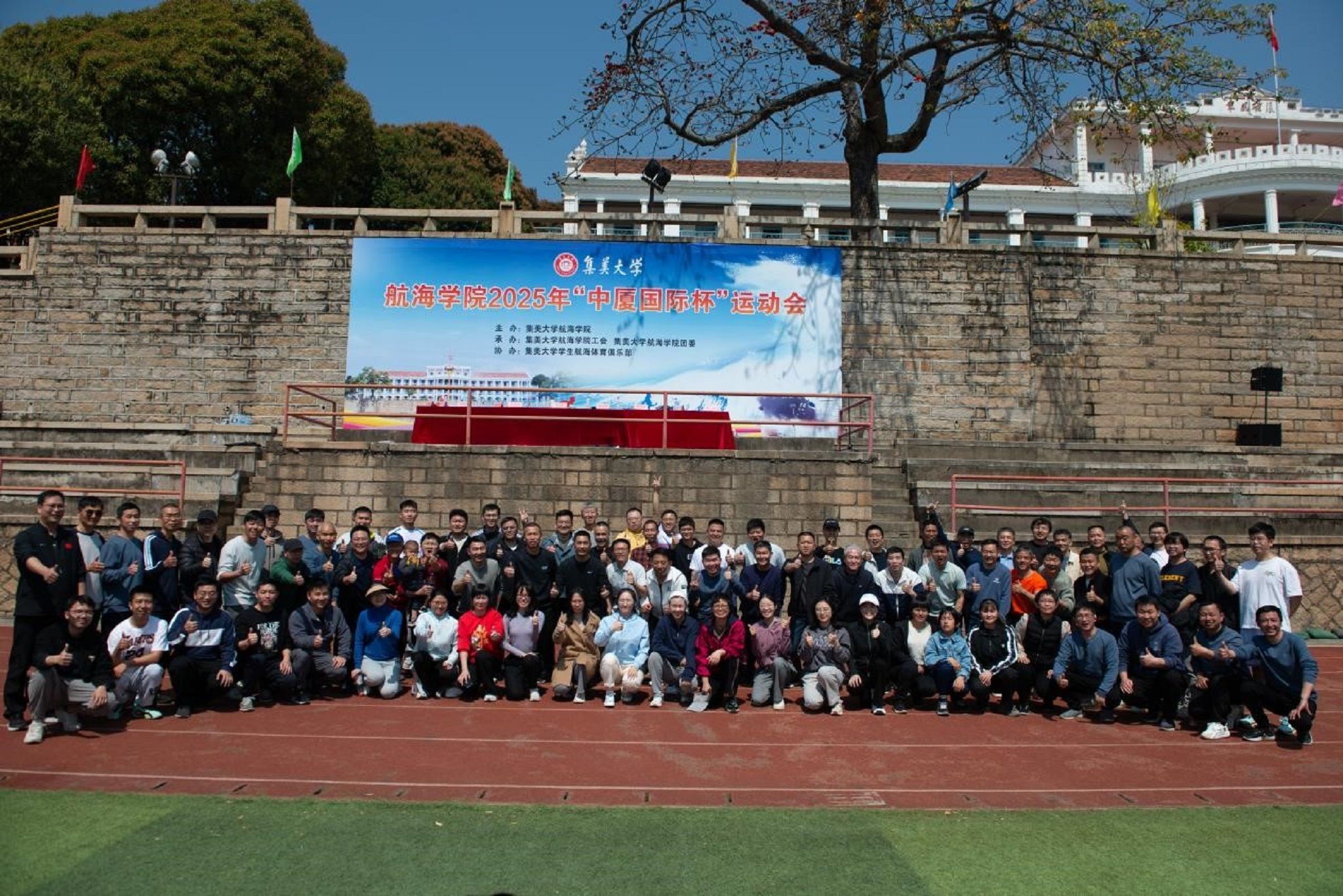 为弘扬体育文化,强健学生体魄,以更好的精神状态迎接本科教育教学审核评估,3月22日,我院举办“中厦国际杯”运动会。厦门国贸控股集团中厦国际董事长黄跃德、中厦国际副总经理鲁金校、中厦国际海员劳务部副总经理黄伟文、航海学院师生参加开幕式,院党委副书记蓝良纯主持。