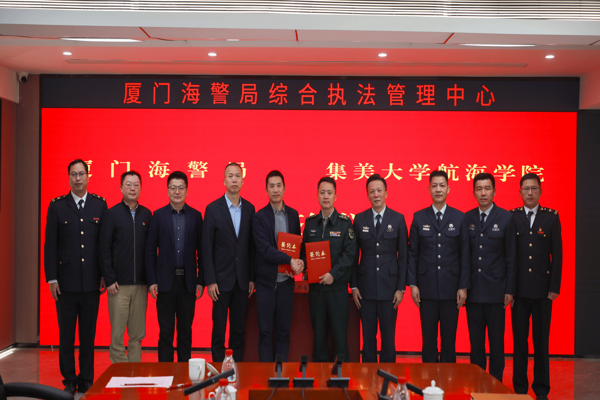 4月2日,航海学院党委书记王小军、院长杨神化、副院长初良勇一行前往厦门海警局参加共建签约仪式。厦门海警局党委书记、政委邵道合、副局长黄勇等参加签约仪式。