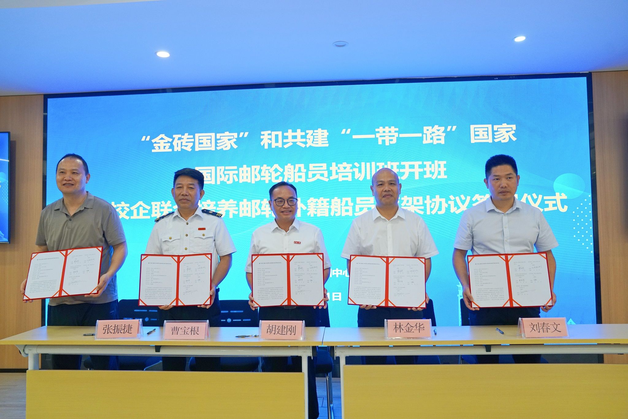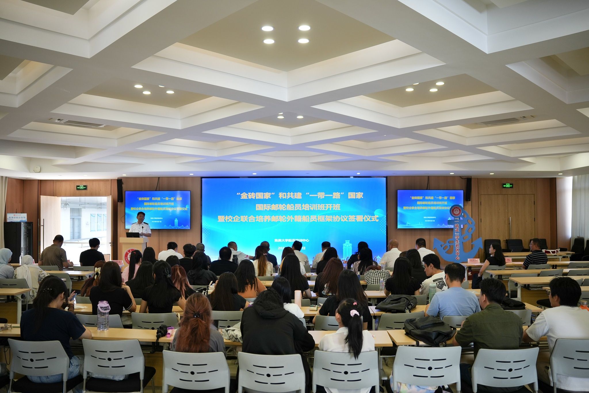 6月21日,“金砖国家”和共建“一带一路”国家国际邮轮船员培训班开班暨校企联合培养邮轮外籍船员框架协议签署仪式在集美大学航海学院举行。中国(福建)自由贸易试验区厦门片区管理委员会、厦门海事局、厦门港口管理局、华侨大学华文学院、华侨大学国家语言服务出口基地、厦门海洋职业技术学院继续教育学院、厦门市海员培训中心、厦门海陆海事服务有限公司以及集美大学国际合作交流处、船员培训中心、航海学院等单位参加。