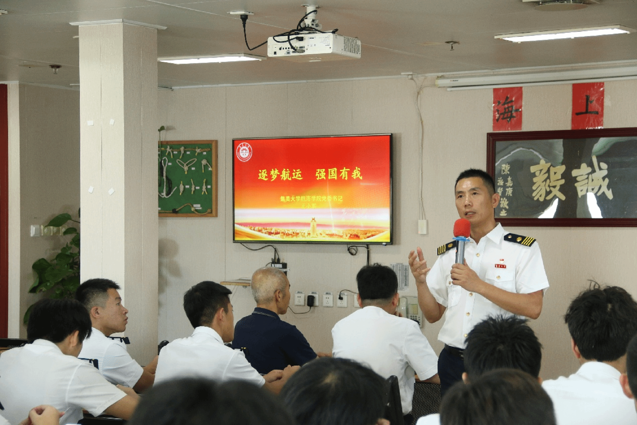 升旗仪式结束后,院党委书记王小军以“逐梦航运 强国有我”为题,为全体师生和船员讲授专题党课;育德党支部开展了“党员讲党课“、 重温入党誓词等系列主题党日活动,以激昂的状态庆祝中国共产党104岁生日快乐。