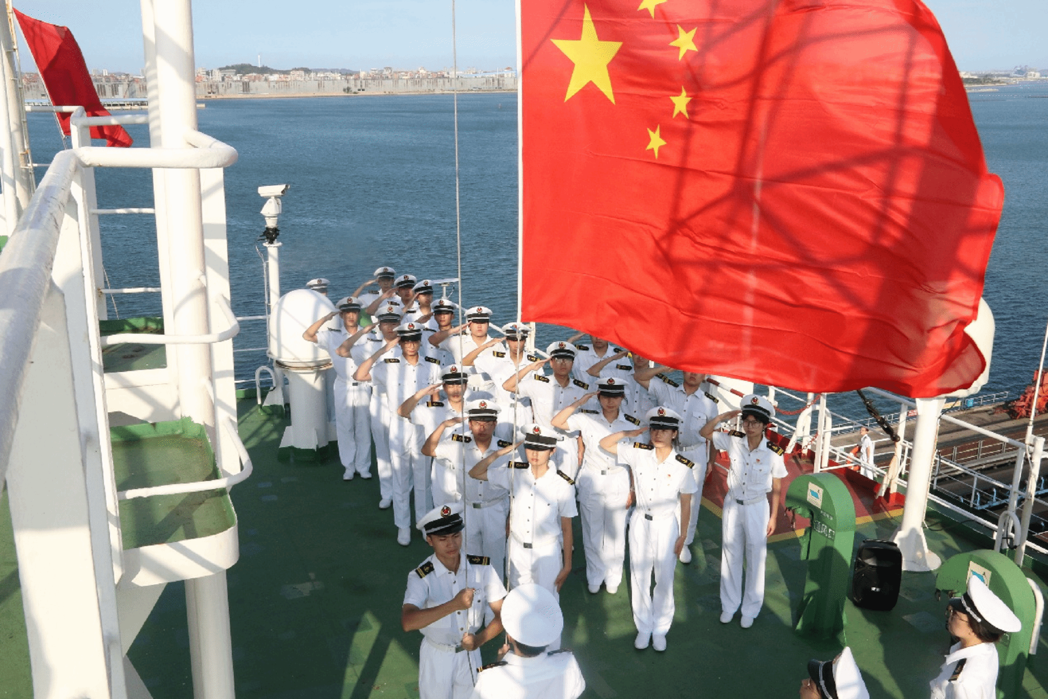 在台湾海峡海面上,“育德”轮上的师生用信号旗整齐划一打出“祝福中国共产党104岁生日快乐”首字母,深情告白党。伴随着国歌,鲜艳的五星红旗冉冉升起,全体师生向国旗敬礼,并献上最诚挚的祝福:“伟大的党,生日快乐!”