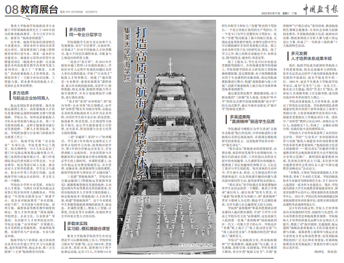 近日,《中国教育报》(2022年5月17日08版教育展台)发表航海学院院长杨神化教授、航海技术系副主任郑尚龙副教授的署名文章《打造高质量航海人才培养体系》。现全文转载如下: